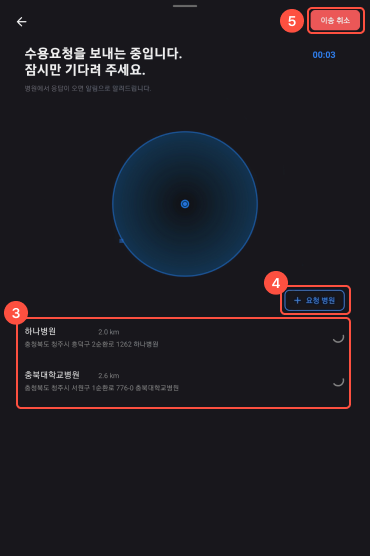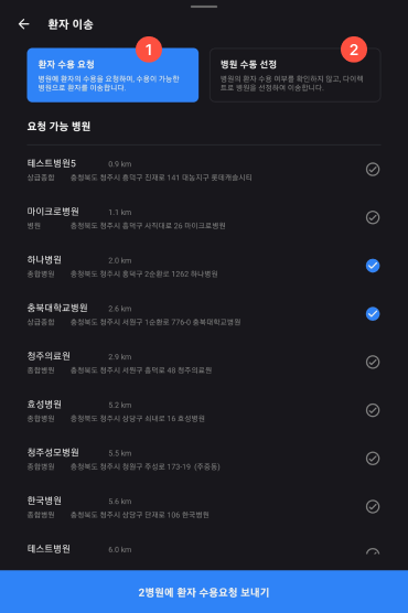 1환자 수용 요청 : 요청 가능 병원 리스트에서 요청할 병원을 선택한다. (최초 수용 요청시 최대 3개 병원 요청 가능, 이후 1개 병원씩 추가 요청 가능하다.)