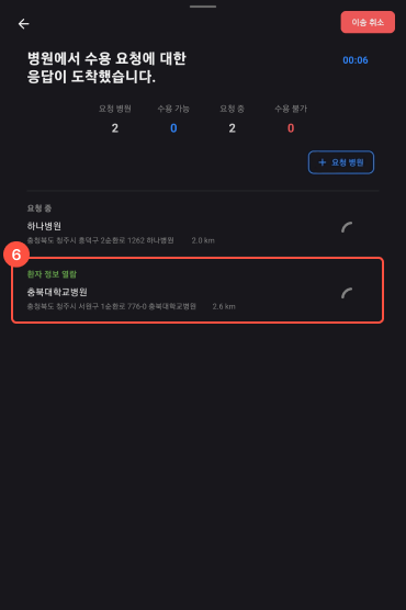 5이송 취소 : 이송불필요 / 타병원 이송 / 현장 처치 / 이송 거부 / 이송 거절 / 경찰 인계 / 사망인 경우 또는 이송 요청 중 전화 통화 등으로 병원이 선정된 경우 이송 취소 버튼을 클릭한다.