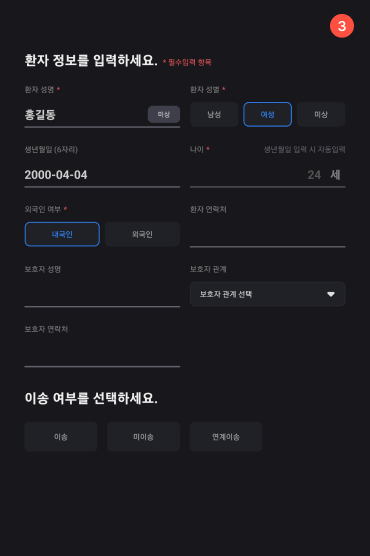 3환자 정보를 입력한 후 이송여부를 선택한다. (* 필수 입력항목을 작성해야 이송여부 선택란 활성화)