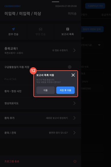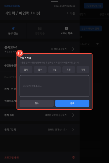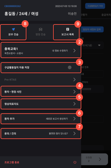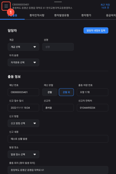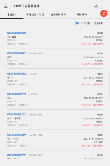 6 해당 재난에 환자추가(새로운 보고서 생성)하는 메뉴이다.