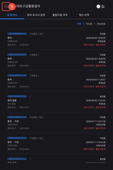1 재난번호 왼쪽 상단의 삼색선을 클릭한다.
