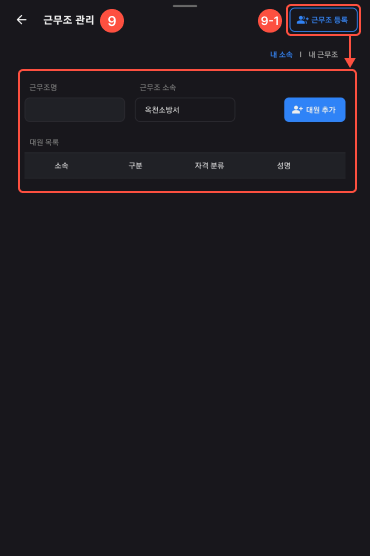 9-1 근무조 관리 항목 클릭시 대원을 추가하여 근무조를 등록할 수 있다.
