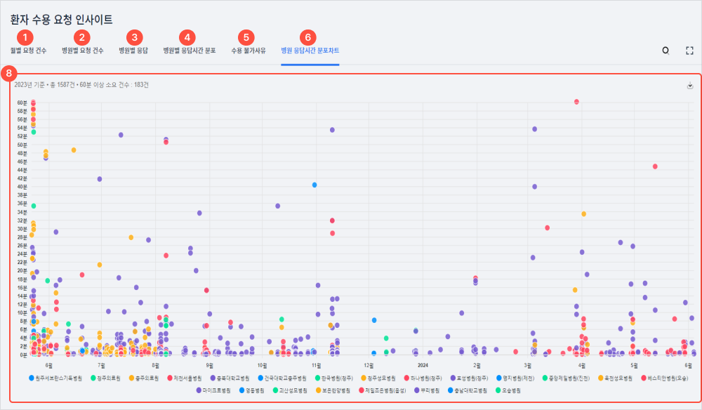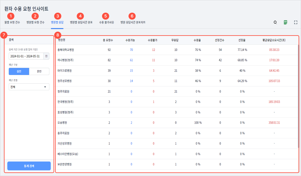 8월별 요청 건수, 병원별 요청 건수, 병원별 응답, 병원별 응답시간 분포, 수용불가 사유, 병원 응답시간 분포차트가 조회된다.