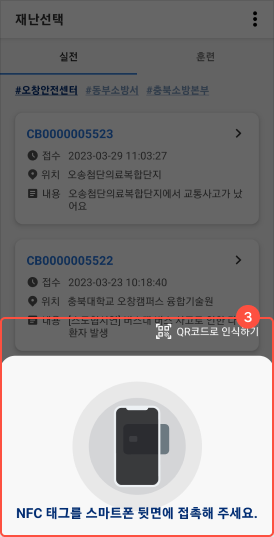 3환자용 e-Triage tag를 아래 4와 같은 방법으로 태깅 또는 QR코드로 인식