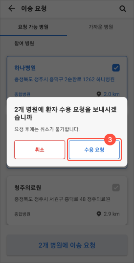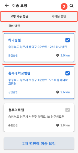 2추천, 참여병원 리스트 중 이송 요청할 병원 선택 또는 가까운 병원 리스트 중 선택