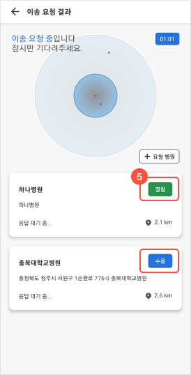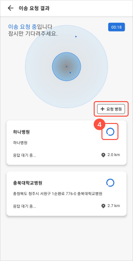 4이송 요청 후 병원에서 열람 전일 경우 병원 명 우측에 로딩중 아이콘 표시 * 우측 요청병원 버튼을 클릭하여 요청 병원 추가 가능