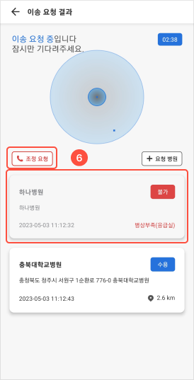 6병원에서 이송요청 불가 답변시 불가(사유)표시 * 2분간 무응답 또는 요청을 보낸 모든 병원이 수용 불가일 경우 좌측에 조정요청 버튼이 활성화