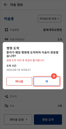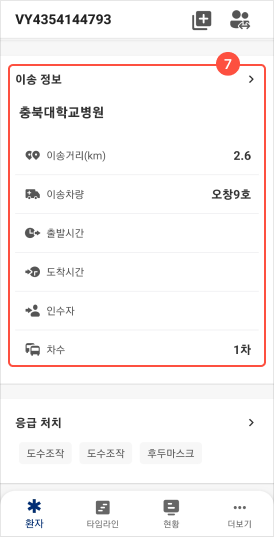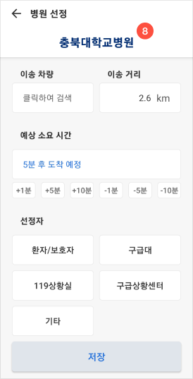 7이송요청을 수용한 병원 중 환자를 이송할 병원의 수용 아이콘 클릭 후 이송 정보란 선택